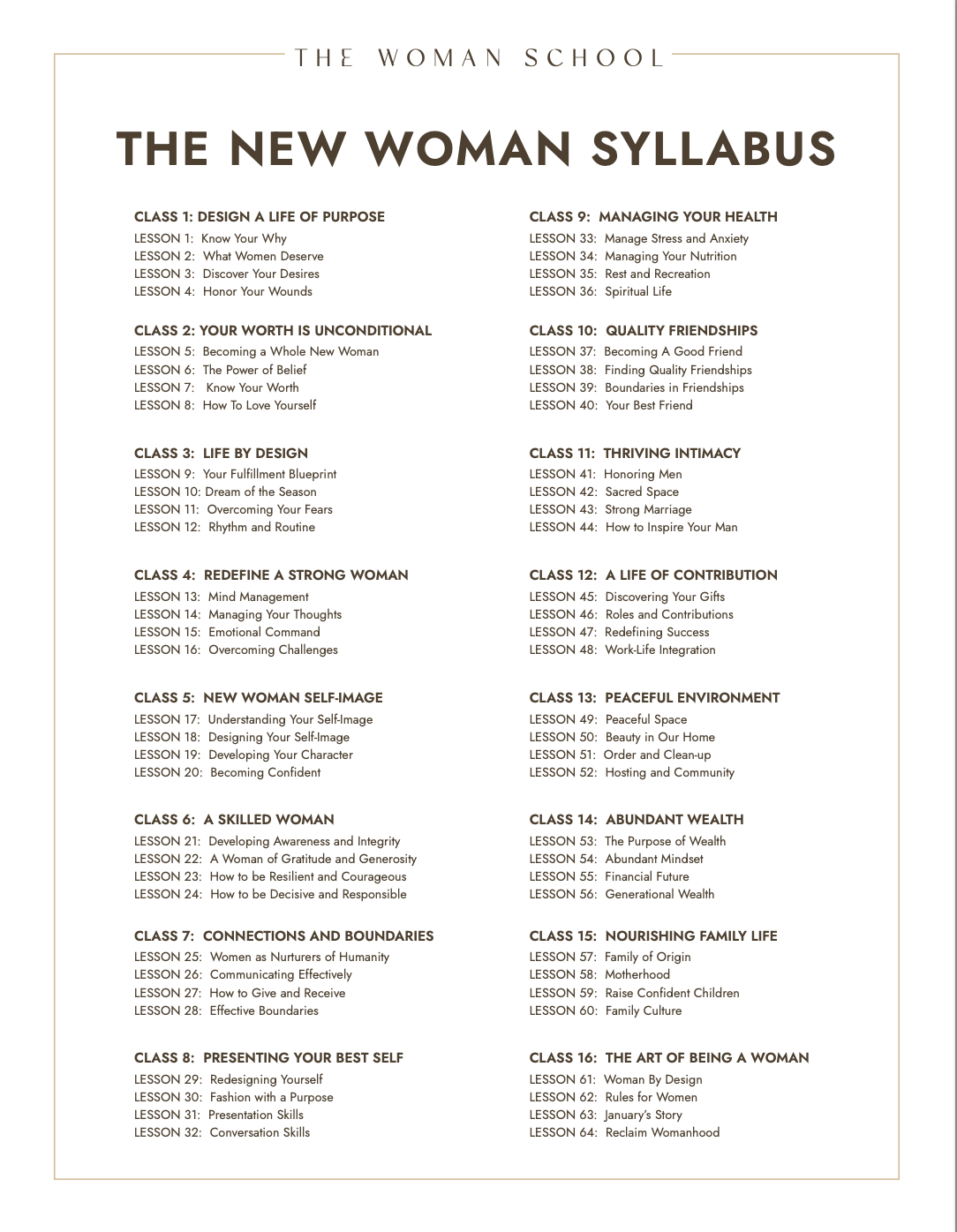 “This class [The Woman School Masterclass] has helped me overcome so many of my obstacles that were holding me back from becoming the best version of myself…The Woman School has helped me rewire my thoughts and know that my worth is not wrapped up in how big my house is or how much I weigh…”